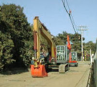 荒地行走试验的场景。模拟在路面状况差的场所的行走,于模拟道路上行走以对下部行走体、上部回转平台实施耐久性评价。